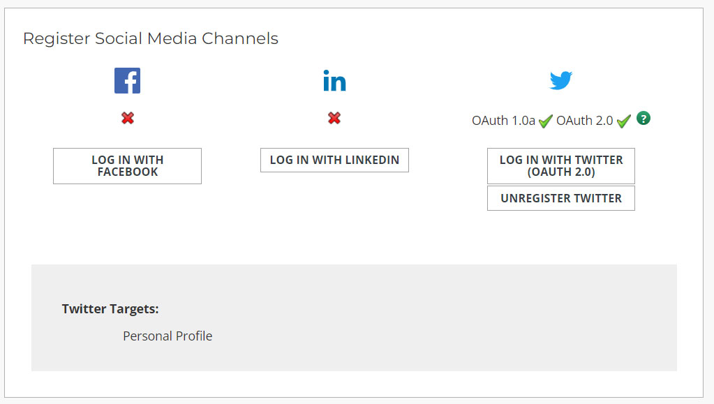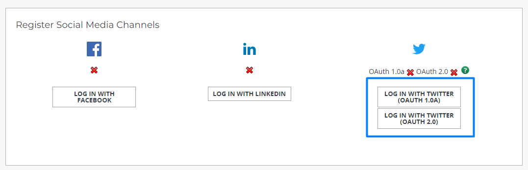 To register your Twitter account please select “LOG IN WITH TWITTER (AUTH 1.0A) AND LOG IN WITH TWITTER (AUTH 2.0)” under the Twitter logo.
