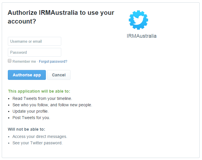 Next, you will be asked to log into your Twitter account via the following screen. Enter your details and select the "Authorise app" button to continue.